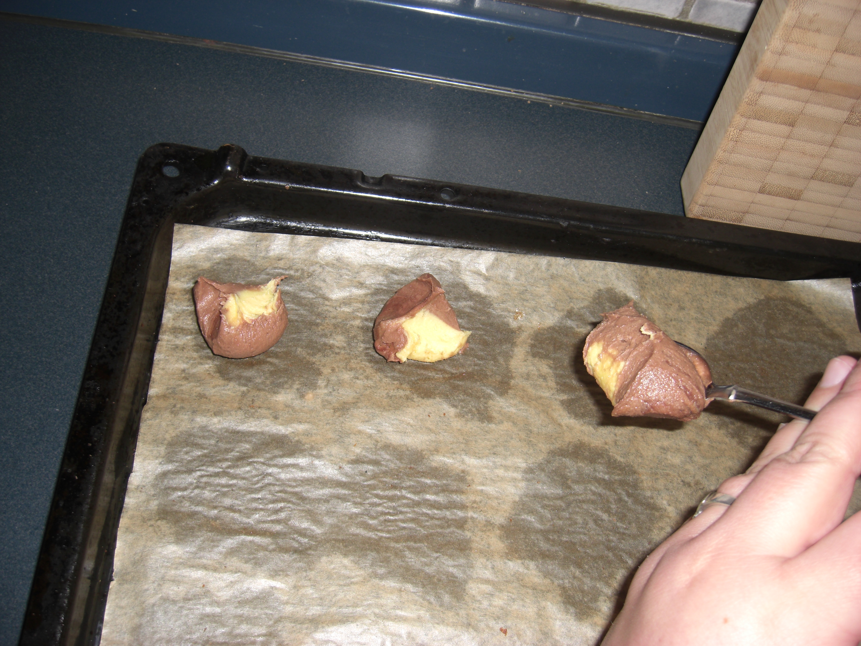 150 g weiche Butter mit dem Handrührgerät geschmeidig rühren. Nach und nach 120 g Zucker und 1 Päckchen Vanillin-Zucker unterrühren, bis eine gebundene Masse entstanden ist. 1 Ei in etwa 1/2 Minute unterrühren. 120 g Weizenmehl mit 50 g Speisestärke und1 TL Backpulver sieben und in zwei Portionen kurz auf mittlerer Stufe unterrühren. Den Teig halbieren. Eine Teighälfte in einen tiefen Teller geben und glattstreichen. Restlichen Teig mit 1 EL Kakaopulver und 1 EL Milch verrühren, auf die Teighälfte in den Teller geben und glattstreichen. Mit einem Teelöffel Häufchen abstechen und auf ein mit Backpapier belegtes Backblech geben.