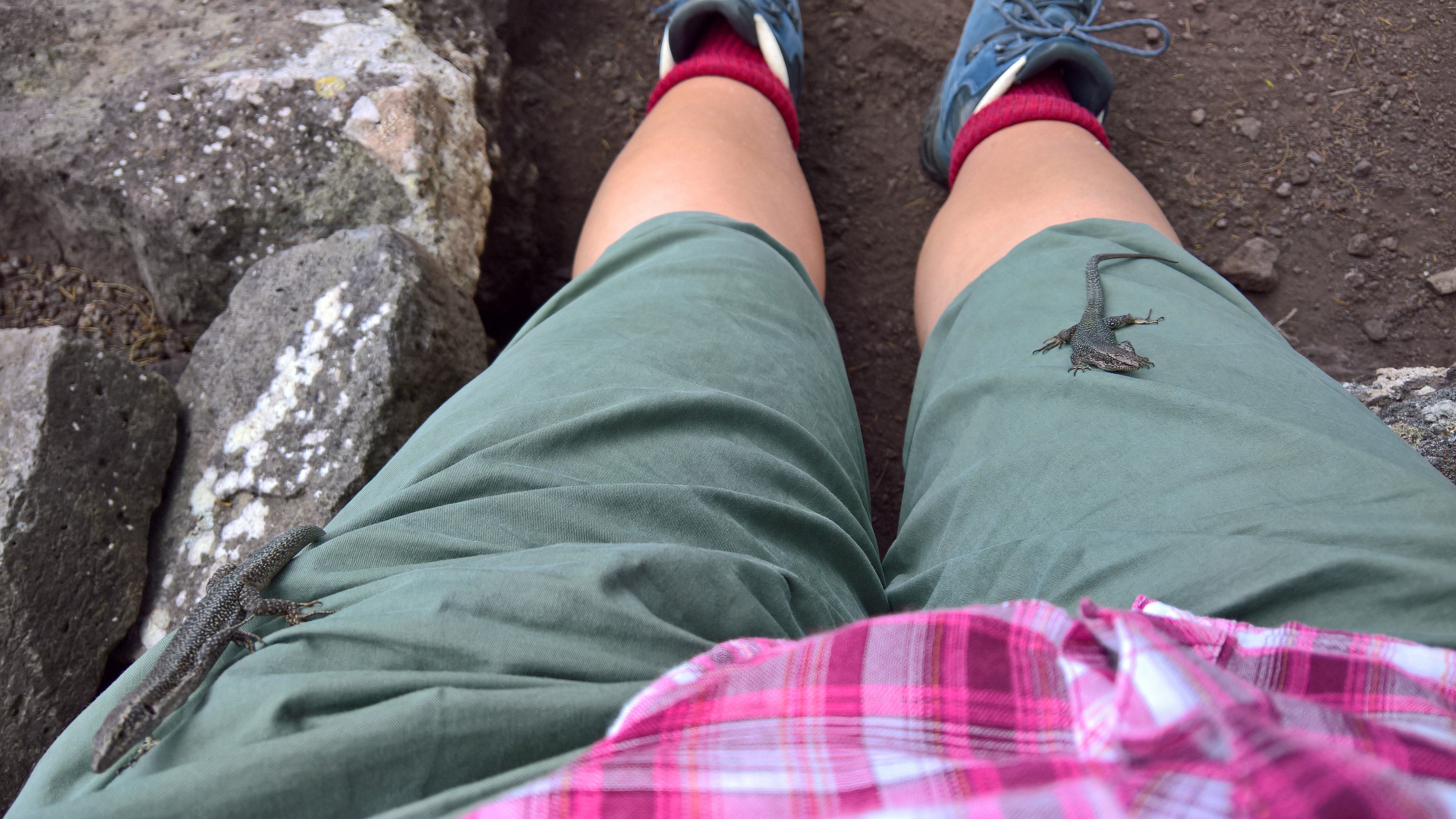 Joao bringt uns über die Nordseite der Insel bis zum Ausgangspunkt der Wanderung. Dort gibt er uns noch den Tipp, ihn für die Rückfahrt bereits oben auf dem Hügel anzurufen, da hier kein Handyempfang ist. Jasmin und ich machen uns auf den Weg. In sanft ansteigenden Serpentinen schlängelt sich der Pfad den Berg hinauf. Der Himmel ist wolkenverhangen, aber es ist angenehm warm. Nach rund 90 Minuten entscheiden wir uns dazu, erst den Gipfel des Pico Branco zu erklimmen. Die zum Teil in den Fels gehauenen Stufen sind uneben, oftmals findet sich ein Seil als Handlauf. Auf dem Gipfel angekommen klart es auf – ein phantastisches Farbenspiel erstreckt sich zu unseren Füßen. Ich setze mich auf einen Stein und bin binnen weniger Minuten von Eidechsen belagert. Nach einem Pickup geht es wieder abwärts bis zur Kreuzung, wo wir den Weg zur Terra Cha einschlagen.